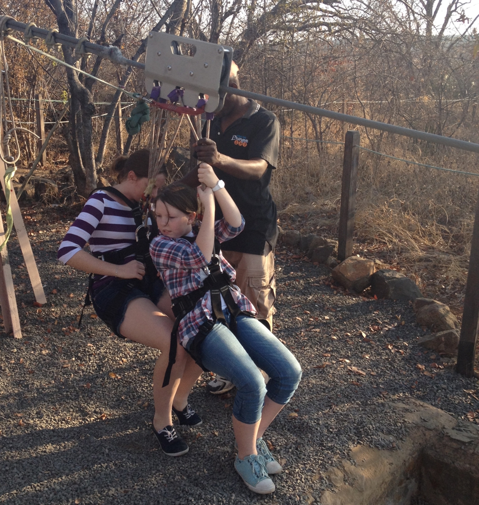 Tess & katie very courageously went across the Vic Falls Gorge on a zip slide while my husband and I looked on in awe.  They did say that even Grannys could do it but I decided I didn’t need that type of thrill at my stage of life.  They were a little apprehensive when buckling up but loved it once they were away.