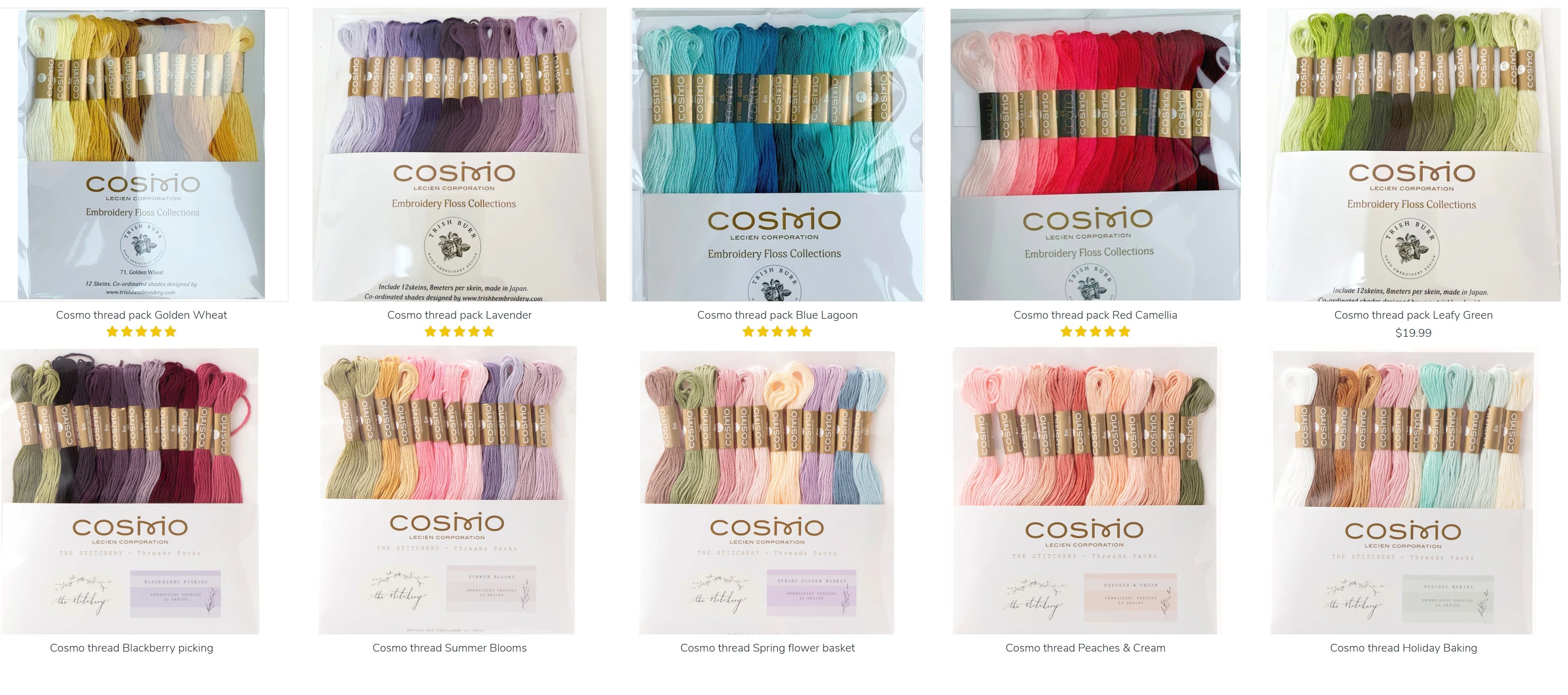 This week I am pleased to let you know that the Cosmo thread packs are back in stock and there are five new thread packs with co-ordinated colors for you to enjoy. COSMO Embroidery Floss, manufactured in Japan, has a wide assortment of 501 beautiful colors. They are made from superior quality raw cotton in vivid colors and soft silky textures. Cosmo is renowned and beloved in Japan and all over the world including North America, Asia, Europe and Australia.